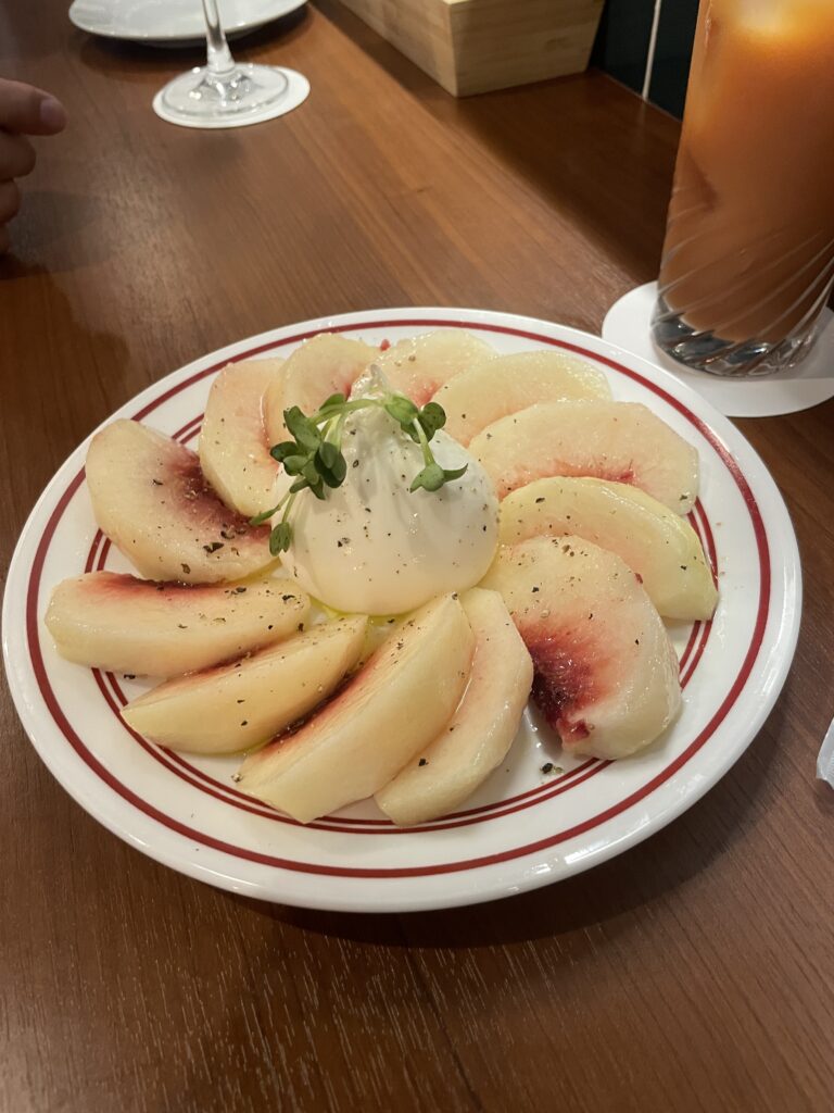 最初の料理がいきなり果物の桃の料理がでてきました。 みんなびっくり( ゚Д゚)